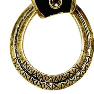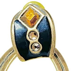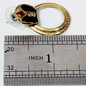 Introducing a pair of vintage Chico’s earrings in gold tone finish. These designer earrings feature black enamel detailing along with yellow and clear stones, creating a bold and elegant look. Item is in used condition.