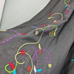 Vintage floral embroidered circle midi skirt from Chicos, size estimated as medium to large. Lightweight cotton exterior. Lined. Brown with purple, blue, yellow, and red embroidery. Elastic pull on waist. Ideal for boho, coloful, hippie, Y2k, and twee vibes. Perfect for spring, summer, work, vacation, and everyday.
