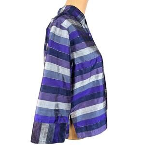 chicos vintage silkblouse purplestripe iridiscentbuttons 34sleeve buttondown collared splitsides luxuryfabric naturalsilk womenswear vintagestyle classic timeless structured sophisticated refined elegant premium luxuryfiber silkyblouse womensblouse womensfashion buttonfront silkshirt