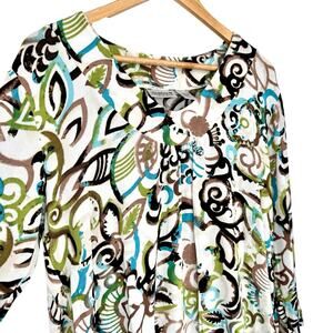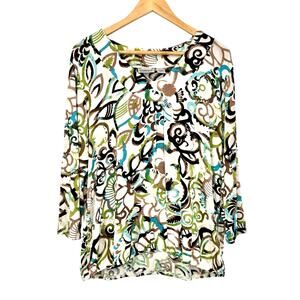 This Chico’s Travelers knit top features a vibrant abstract floral and paisley-inspired print in earthy greens, blues, browns, and neutrals on a white background. Designed with a flattering scoop neckline, subtle front pleating, 3/4 sleeves, and elastic hem, this top has an easy, relaxed silhouette that drapes beautifully. Crafted from Chico’s signature wrinkle-resistant Travelers knit fabric, it’s perfect for travel or everyday chic comfort.