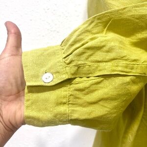 lime green, long-sleeved, button-down blouse made of linen, from the brand Chico's.