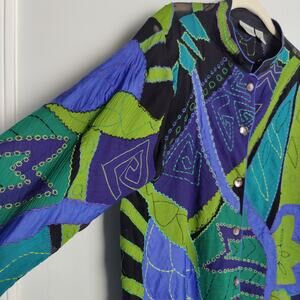 Vintage Chico's green and blue silk button front jacket or tunic top. Long line. Very unique pieced geometric pattern.