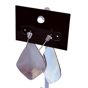 Vintage Chico’s hammered silvertone dangle earrings, new and unworn on the original card. These lightweight yet bold earrings feature a sculptural diamond-shaped drop with a reflective hammered texture that catches the light beautifully. Crafted in the early 2000s, the modern organic shape reflects the era’s love of minimalist statement metalwork with clean, fluid lines. Total length is approximately 2.10". Silvertone metal with ear wires and silicone comfort backs as shown.