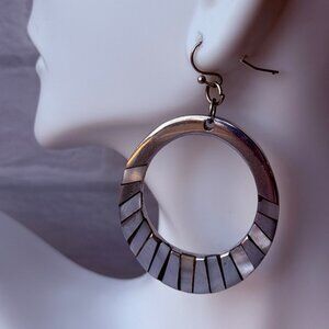 Beautiful Chico’s silver-tone statement earrings featuring gleaming mother-of-pearl style accents arranged in an angled inlay pattern. These earrings date to the 2010s, reflecting the decade’s love of bold geometric silhouettes and mixed-material shine.