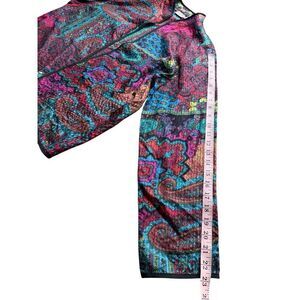 Add a burst of bohemian flair to your wardrobe with this vintage Chico’s lightweight quilted jacket, crafted from luxurious 100% silk. Featuring an open-front design, this piece showcases a vibrant multicolored paisley pattern in rich jewel tones of teal, magenta, red, and gold. Perfect for layering, it combines effortless comfort with eye-catching style, making it ideal for festivals, casual outings, or adding a statement touch to any ensemble.