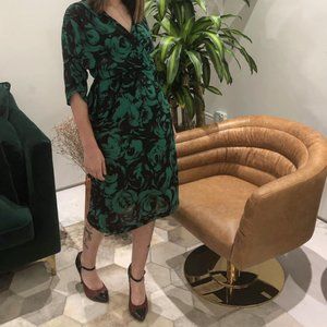 It has a mid length sleeve. A crossover bodice for a V neck. I am 5' 2" and the length hits just below the knee. there are draped pieces at the hips for a more dramatic shape.
