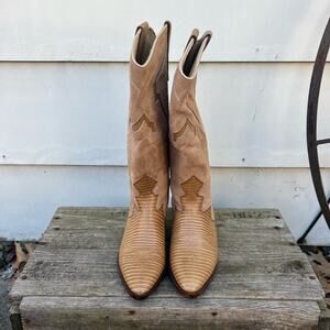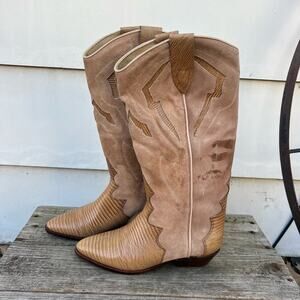 Vintage Chili's Brown Tan Teju Lizard Print Low Heel Riding Boots Size 6