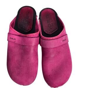 Step into statement style with these vintage CHILIS clogs featuring a vibrant hot pink suede upper and a chunky black platform sole. Brand stamp on the side of band across vamp. Open back. Staple detail around the sides. Rounded toe.