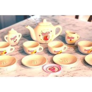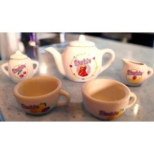 The set comes with a tea pot, coffee pot, creamer, sugar bowl, and six cups and saucers, all in a delightful Barbie-inspired design.