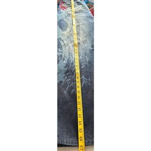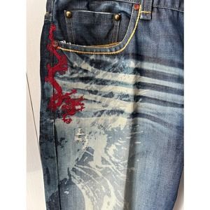 Embroidered Japanese dragon jeans // factory distressed, wide leg // rare, like new! // 40" waist // Waist: 20" // Leg Opening: 11" // Inseam: 35" // Length: 47"