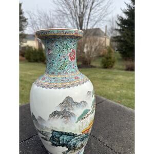 Vintage Chinese 14.5” Porcelain Vase Hand Painted Mountain Landscape Floral
