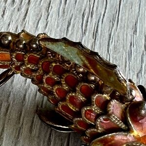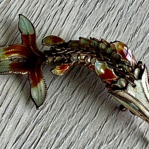 Beautifully crafted vintage Chinese articulated fish pendant with rich, hand-applied enamel in hues of burnt orange, ochre, and celadon green. The detailed cloisonné work and fully jointed segments create graceful movement — a hallmark of mid-century Chinese export design.