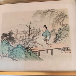 Vintage Chinese Asian Paintings on Silk Woman in Landscape Gold Frame