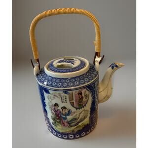 Vintage Chinese Blue & White Porcelain Teapot Woven Handle Asian Scene