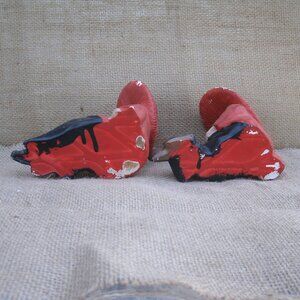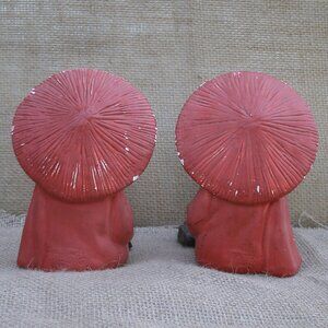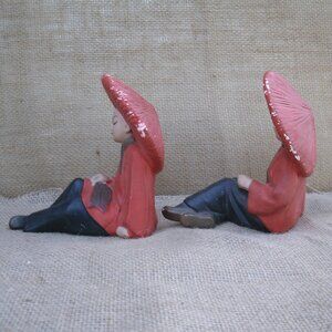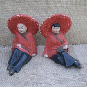 Vintage Chinese boy and girl figurines from 1940s. Made of chalkware and hand painted. Made by Dexter Mahnke. Figures are seated. Girl has a fan, boy has a feather. Red tops, black pants, red hats. 5 inches high, 3 inches wide, 5 inches long. Good vintage condition. Boy: surface/paint chipping along hat edge, paint rub on hat back, bottom has spots where it stuck to surface because of wet paint. Girl: surface/paint chipping along hat edge, paint rub on hat back and front, paint missing spots on bottom caused by sitting on a surface before paint was dry, larger spot with surface chipping.