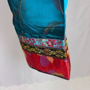 Type: Traditional Chinese brocade pants. Vintage style Chinese brocade trousers featuring a teal satin base with metallic embroidered feather details. Accented with bold red brocade cuffs with multicolor woven trim. Often part of a qipao set, Tan suit, or ceremonial loungewear)