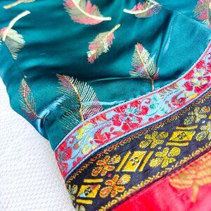 Pattern : teal base with metallic embroidered feather motif with bold red brocade cuffs with multicolor woven trim