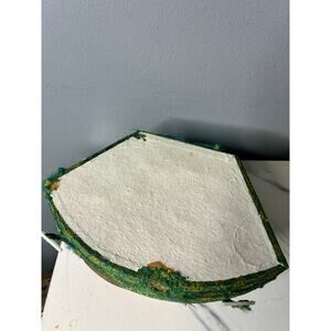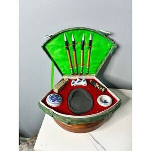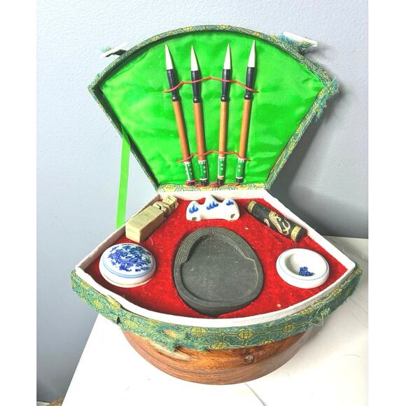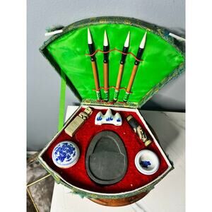 A beautifully composed vintage Chinese calligraphy set, housed in a traditional fan-shaped green brocade case with red velvet interior. This set includes classic scholar tools used for brush calligraphy and ink preparation — equal parts functional and display-worthy.