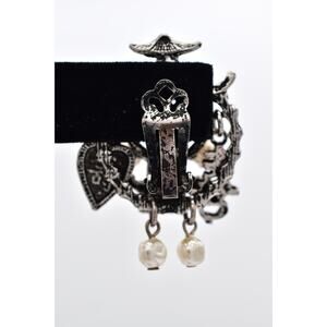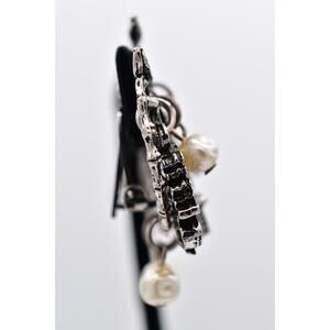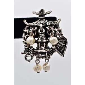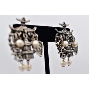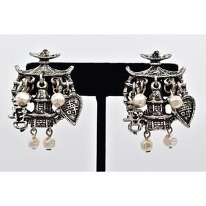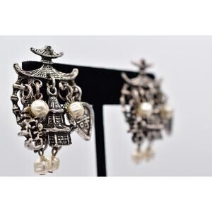 Vintage Chinese Charm Clip On Earrings House Heart Pearl Dangle Pearl 60s BinAF