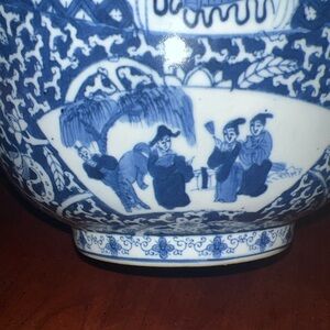 This product is a vintage Chinese Chinoiserie blue and white porcelain square ruffled rim bowl dish. It is a collectible item representing Chinese culture, specifically from China. The dish is not handmade but retains its traditional Chinese design, making it a unique and decorative piece for collectors or those interested in Asian ethnicities.