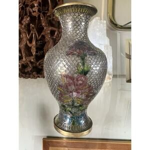 Vintage Chinese Cloisonné Enamel Vase Floral Design Brass Rim Mid Century
