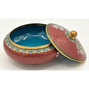 Vintage Chinese Cloisonné Enamel on Bronze Lidded Bowl Trinket Dish Floral Teal