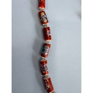 Vintage Chinese Cloisonne Floral Glass Bead Necklace With Barrel Clasp 22" Red M