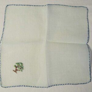 The set is made from a fine, lightweight fabric and features intricate stitched cross-stitch embroidery in classic scenes. The tablecloth is adorned with charming depictions of pagodas and a person on a donkey crossing a bridge, all framed by a distinctive blue thread border and corner motifs. Each of the four matching napkins features a single, beautifully embroidered tree. The entire set is finished with a delicate blue crocheted or stitched edge.