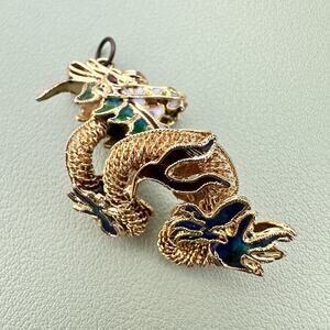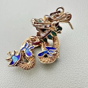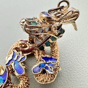 Stunning vintage Chinese dragon pendant in gold-tone filigree metal and vibrant cloisonné enamel in rich shades of blue, green, and red. This dimensional piece showcases exquisite detail from the scaled tail to the expressive face and whiskers. A collectible symbol of strength and good fortune.