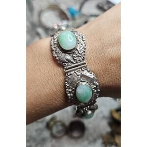 Vintage Chinese Export Silver Jadeite Bracelet Filigree Scrollwork Art Deco