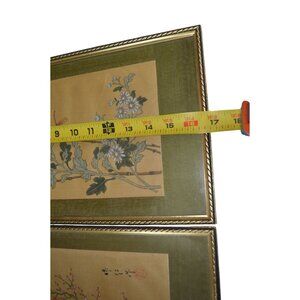 Vintage Chinese Geisha Floral Prints on Silk in Gilt Frames Set of Two 9x17 Inches