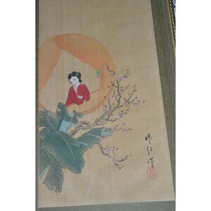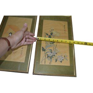 Vintage Chinese Geisha Floral Prints on Silk in Gilt Frames Set of Two 9x17 Inch