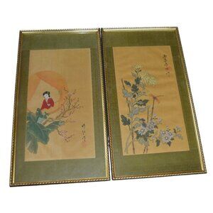 Vintage Chinese Geisha Floral Prints on Silk in Gilt Frames Set of Two 9x17 Inch