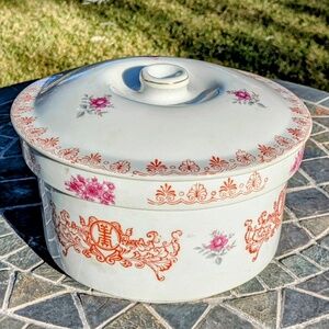 Gorgeous white Stoneware with hand painted designs on the lid and bowl.