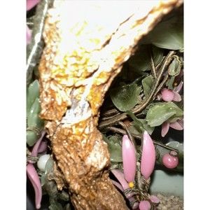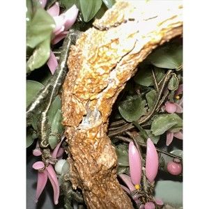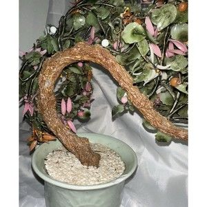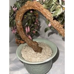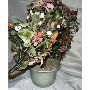 This vintage Chinese bonsai tree is a unique piece of art that will add a touch of culture to any room. The tree is handmade with beautiful jade quartz stones and glass and has a pink hue that is both elegant and eye-catching. Although there is slight damage, please refer to the pictures for more details.