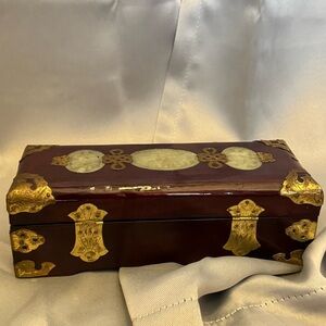Vintage Chinese Jewelry Box Rosewood With Brass and Design red Silk Interior