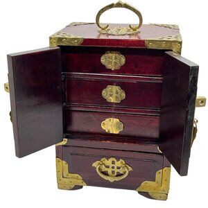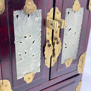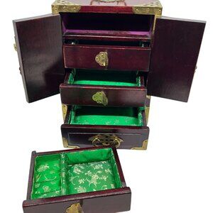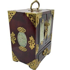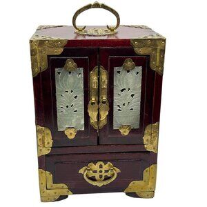 Elegant wooden jewelry box featuring jade inlay and brass details. Includes multiple drawers with silk lining for organization and protection.