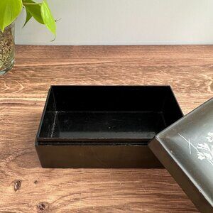 This vintage Chinese lacquered box, made in Fuzhou, China, features a hand-applied silver rooster and floral motif on a glossy black surface. With its clean lines and traditional design, it makes a great men's jewelry box or a unique decorative accent.