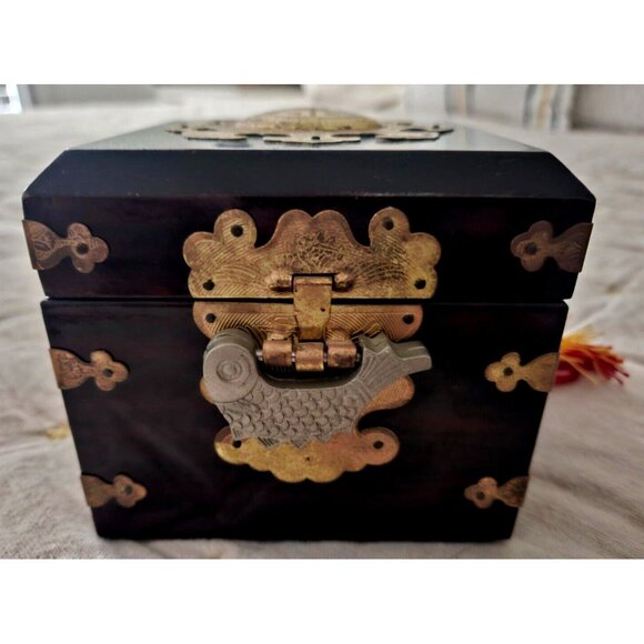 Vintage Chinese Lacquered Jewelry Box Brown and Gold with Koi Fish Lock and Key