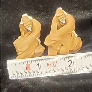 These vintage figurines are Chinese "mudmen," also known as Shiwan ware, a style of unglazed clay pottery. The name "mudmen" is a Western term for these small, detailed figurines that are often used in bonsai or penjing displays. They are known for their lifelike details, often depicting wise old men. Please see the provided photos for further details.