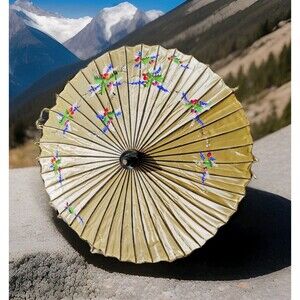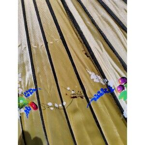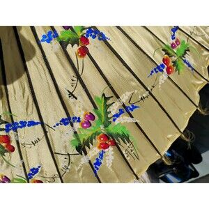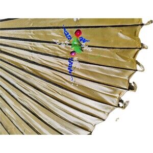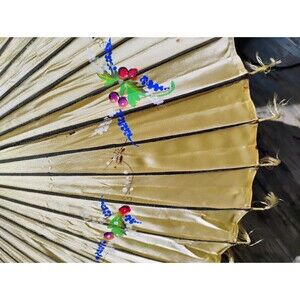 This vintage Asian parasol/umbrella is a unique and handmade piece with a hand-painted oil/wax design on paper and bamboo, complete with tassels. The detailed craftsmanship and traditional design make it a special and collectible item that showcases the rich cultural heritage of Asia.