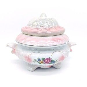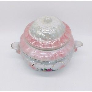This vintage Chinese porcelain ginger jar showcases a beautiful pink and white iridescent design that will add an elegant touch to any room. It stands at 5.5 inches tall and comes with a lid to keep your belongings safe. The jar was made in China and is a great representation of Chinese culture.