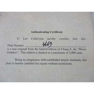 Vintage Chinese Plate By Yi Lin Limited Edition Chang E Moon Goddess plate. This Beautiful Antique / Vintage Original Chinese Plate By Yi Lin Limited Edition of Chang E named "Moon Goddess" plate. It is Signed and numbered in the original box with the COA. This is a beautiful collector plate in excellent new condition in a beautiful silk presentation gift box, 10" diameter, from the Yi Lin Collection titled "Chang E, The Moon Goddess". Also, a plate holder is included and an authenticating certificate of plate number 3669/5000, and also tells the legend of Chang E.