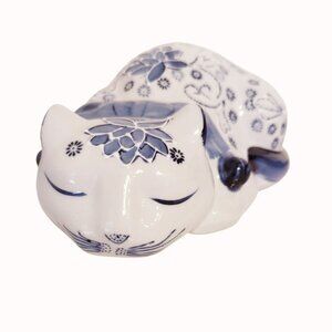 Vintage Chinese Porcelain Blue & White Floral Sleeping Cat Figurine 10-Inches. Condition is preowned. This exquisite porcelain cat figurine exudes an antique charm with its artful blue and white floral design. Crafted with attention to detail, it embodies tranquility. (PM03)