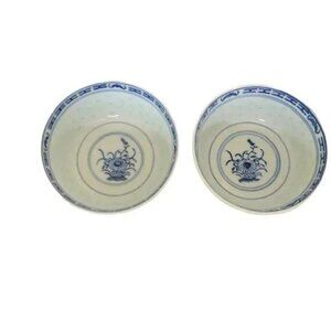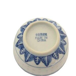 These Chinese rice bowls are vintage from the 1980s. Made of fine porcelain with a blue and white oriental design. Size - bowl is 4 ½” wide x 2 ½” deep x 2” base. Set of 2