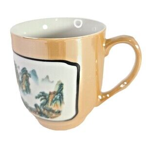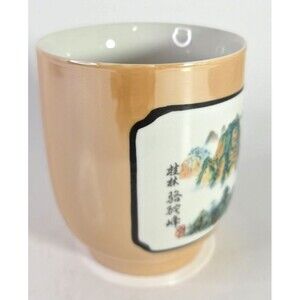 Vintage Chinese Porcelain Tea Mug Handpainted Pearlescent Light Orange 8oz from 1960's era. Beautiful landscape scene Mountains Trees Chinese Writing on left side of image on cup.