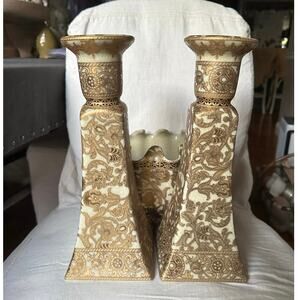 Vintage Chinese set Pair Hand Painted Candle Holders Candlestick gold bowl Asian