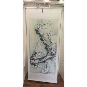 Pre-owned vintage Chinese hand painted wall art, scroll. Thick paper with Damascus fabric as frame hanging strings / ribbons on both ends. Beautiful depiction of tree and white blossom s. Appears to be a watercolor type paint that was used. Comes in original box as shown in last photos