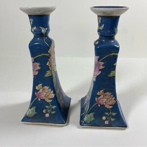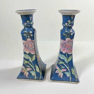 Vintage Chinoiserie Blue and White Floral Japan Ceramic Candlesticks Set of 2