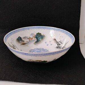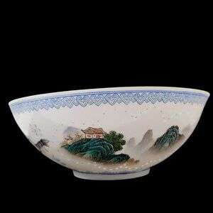 This exquisite vintage Chinese porcelain bowl showcases intricate hand-painted landscapes, embodying the elegance of traditional artistry. The delicate blue floral design encircles a serene scene of mountains and pagodas. A beautiful collector's piece, it reflects the timeless beauty and cultural heritage of Chinese craftsmanship. Its classic design and vintage appeal make it an eye-catching addition to any display or collection.